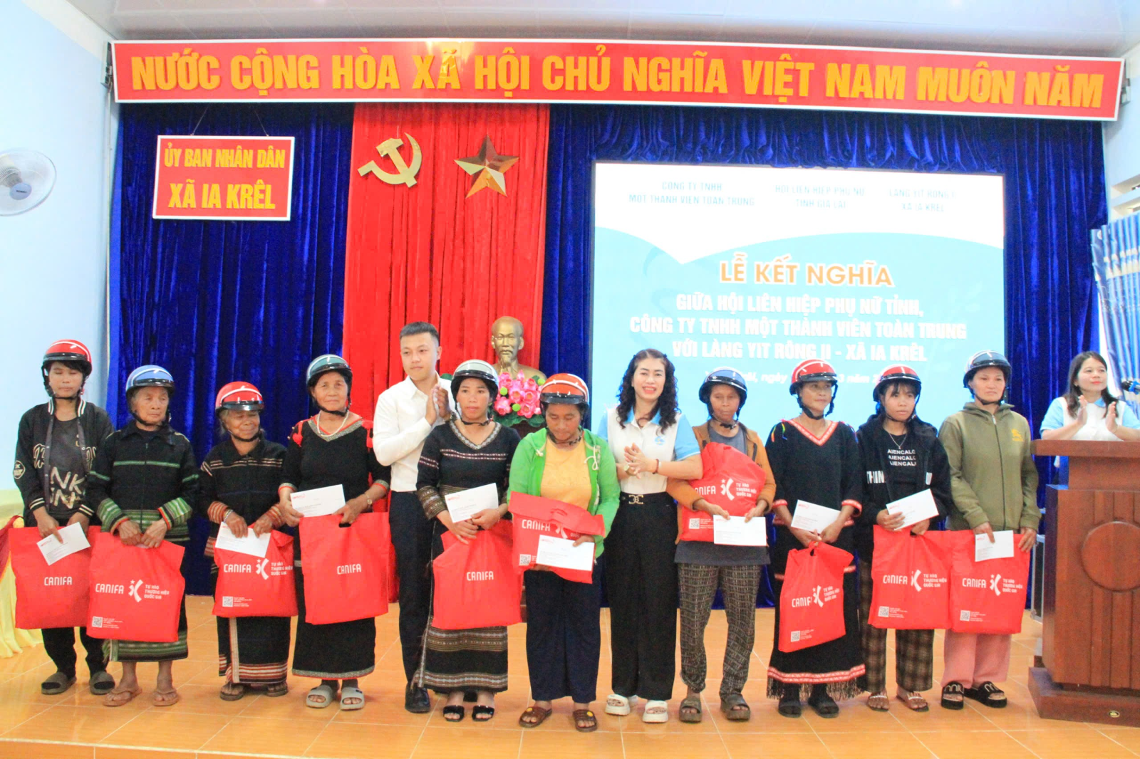 - Công ty TNHH MTV Toàn Trung trao tặng quà cho bà con làng Yit Rông II và 50 chiếc mũ bảo hiểm