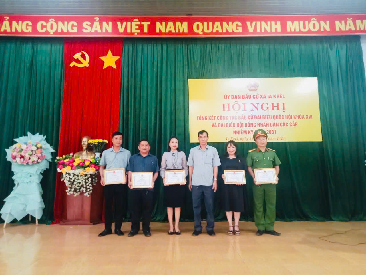 Đồng chí Diệp Bảo Trung - Bí thư Đảng ủy, Chủ tịch HĐND xã kiêm Chủ tịch Ủy ban bầu cử xã Ia Krêl trao giấy khen cho 05 tập thể có đóng góp tích cực trong cuộc bầu cử tại xã.