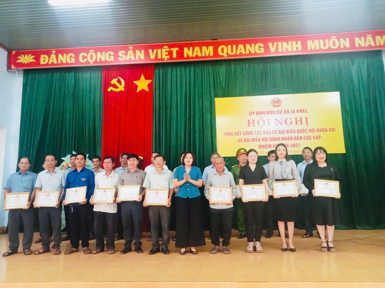 Đồng chí Rơ Châm H’Lệ - Phó Bí thư Thường trực Đảng ủy, kiêm Phó Chủ tịch Ủy ban bầu cử xã Ia Krêl trao giấy khen cho các cá nhân có đóng góp tích cực trong cuộc bầu cử tại xã.