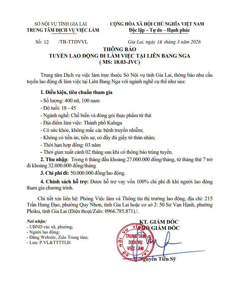 Thứ ba, 24/03/2026 | 15:21 A- A A+ | Thông báo tuyển lao động đi làm việc tại Liên Bang Nga 17.3 Chia sẻ Đọc bài Lưu Tập tin đính kèm Trình duyệt không hỗ trợ iframe.