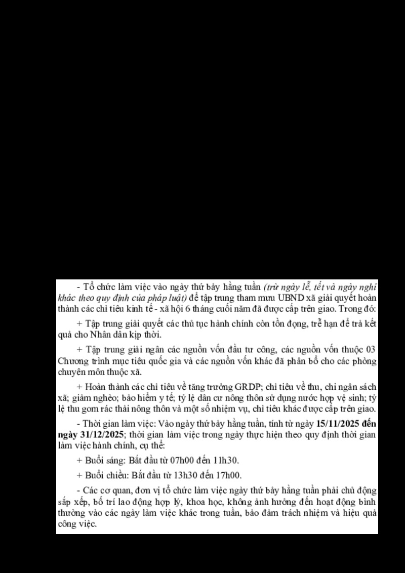 | Tiêu đề văn bản | Công văn: tổ chức làm việc vào ngày thứ bảy để giải quyết các công việc của UBND xã. | ||