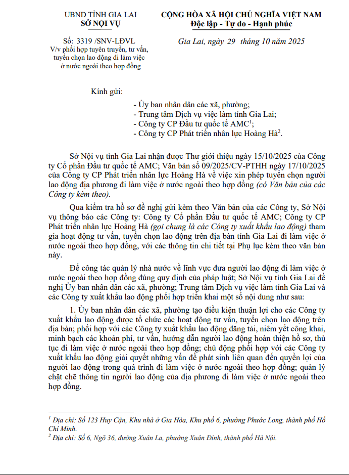 Thứ ba, 04/11/2025 | 10:27 A- A A+ | Phối hợp tuyên truyền, tư vấn, tuyển chọn lao động đi làm việc ở nước ngoài theo hợp đồng Chia sẻ Đọc bài Lưu Tập tin đính kèm Trình duyệt không hỗ trợ iframe.