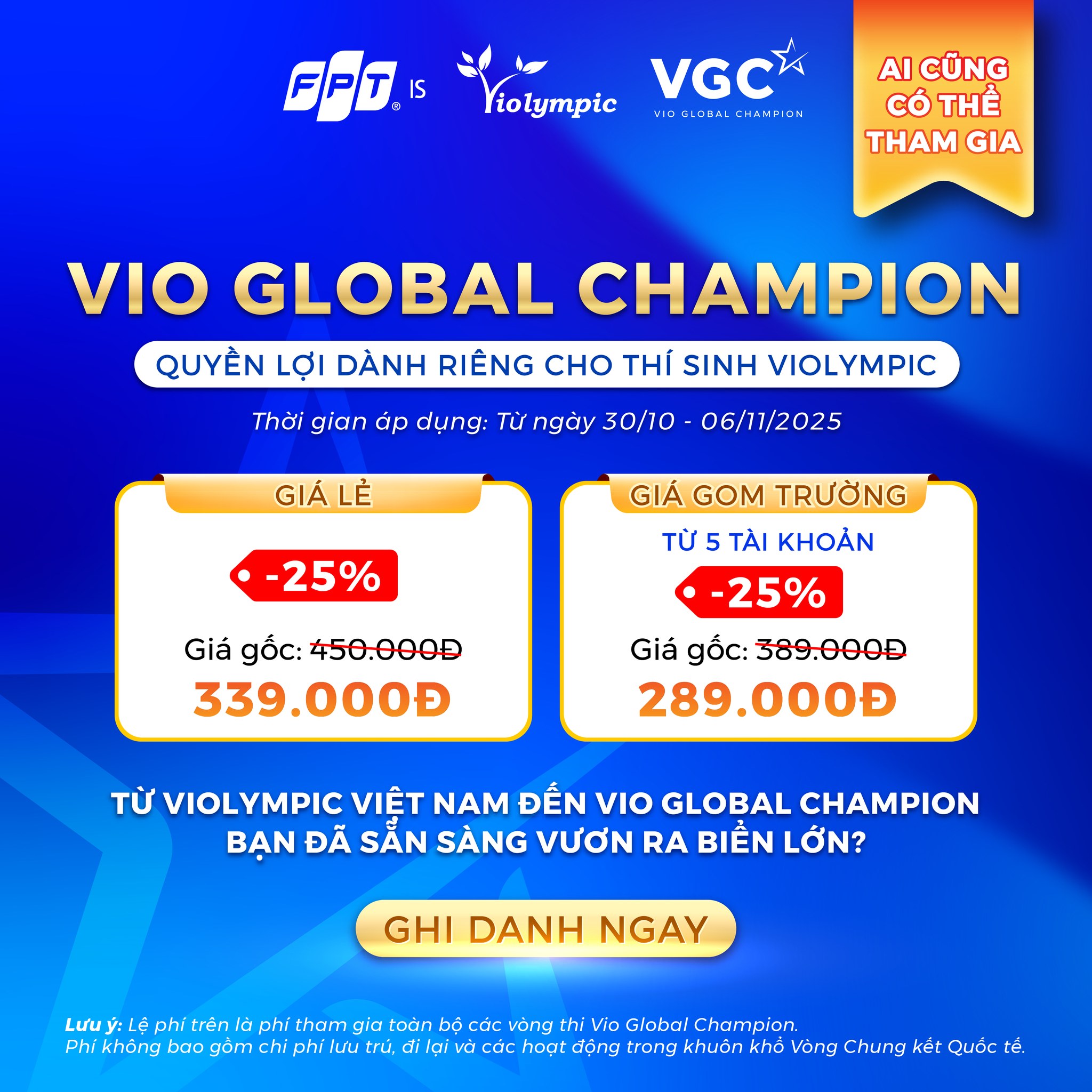 Tiếp nối hành trình 18 năm thành công của Violympic – sân chơi Toán học trực tuyến đầu tiên tại Việt Nam, FPT IS chính thức ra mắt Vio Global Champion – sân chơi Toán học quốc tế dành cho học sinh từ 6–13 tuổi. Vio Global Champion được kỳ vọng sẽ mang đến cơ hội để học sinh Việt Nam và thế giới giao lưu, học hỏi, khẳng định tư duy và bản lĩnh trí tuệ trên đấu trường toàn cầu.