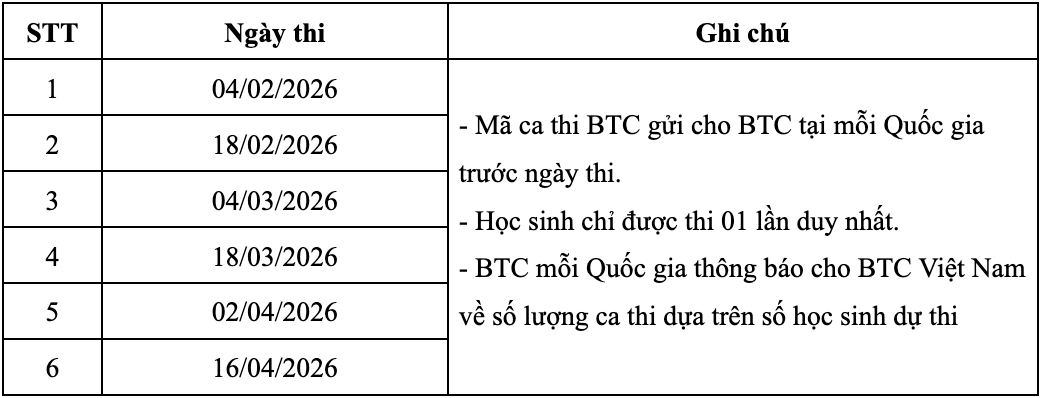– Đối với học sinh Việt Nam: lịch thi và cách thức tham gia sẽ được BTC công bố trên website trước ngày 04/02/2026. Mã ca thi được cán bộ giám sát thông báo cho học sinh dự thi trước khi bắt đầu bài thi 10 phút.